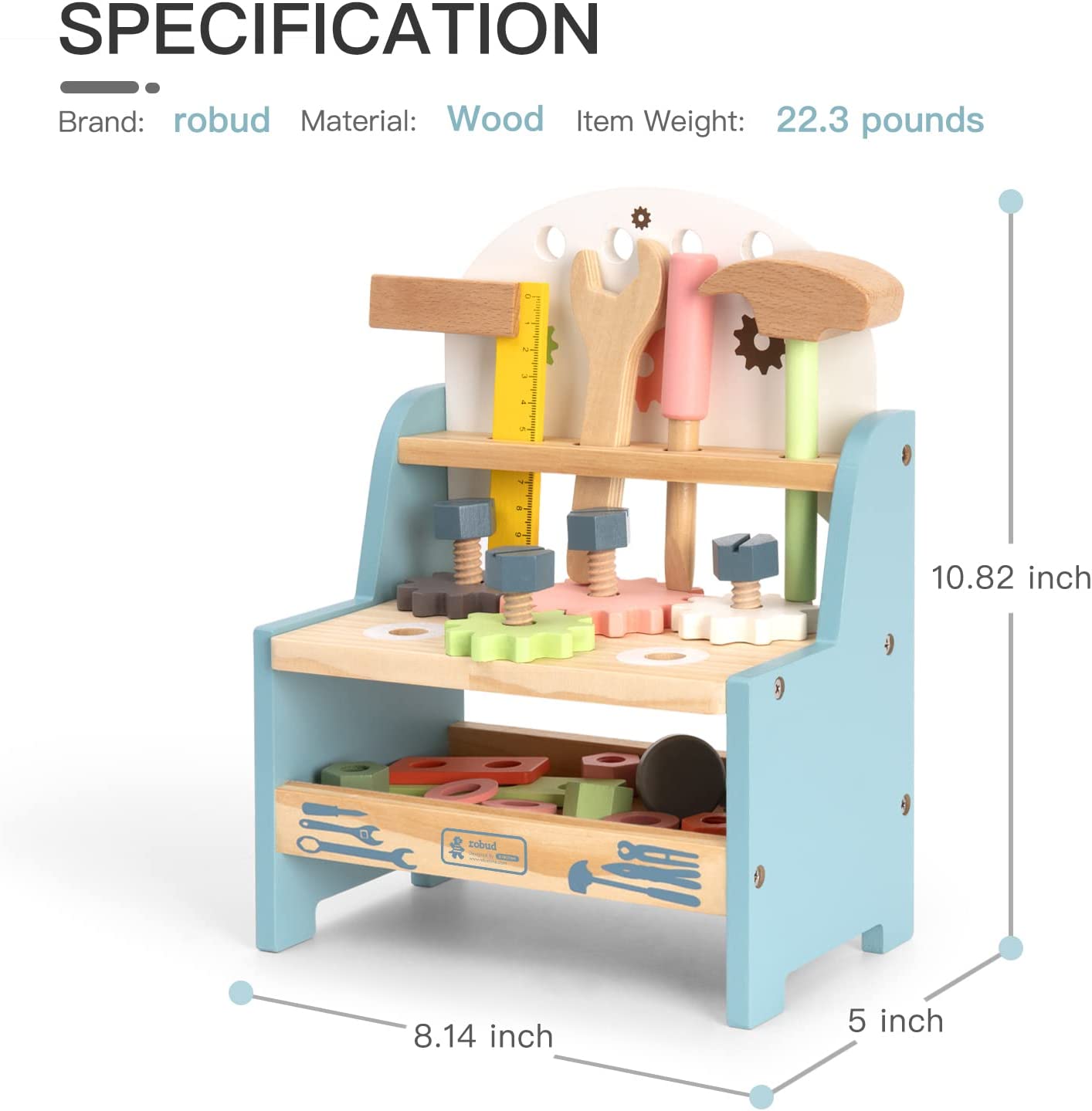 • [ Safety & Nature ] - Robud Workbench made of solid wood, sturdy and durable construction, The surface is smooth without burr, All edge rounded corner design, So your toddlers won't get hurt on this Tool Stand toy