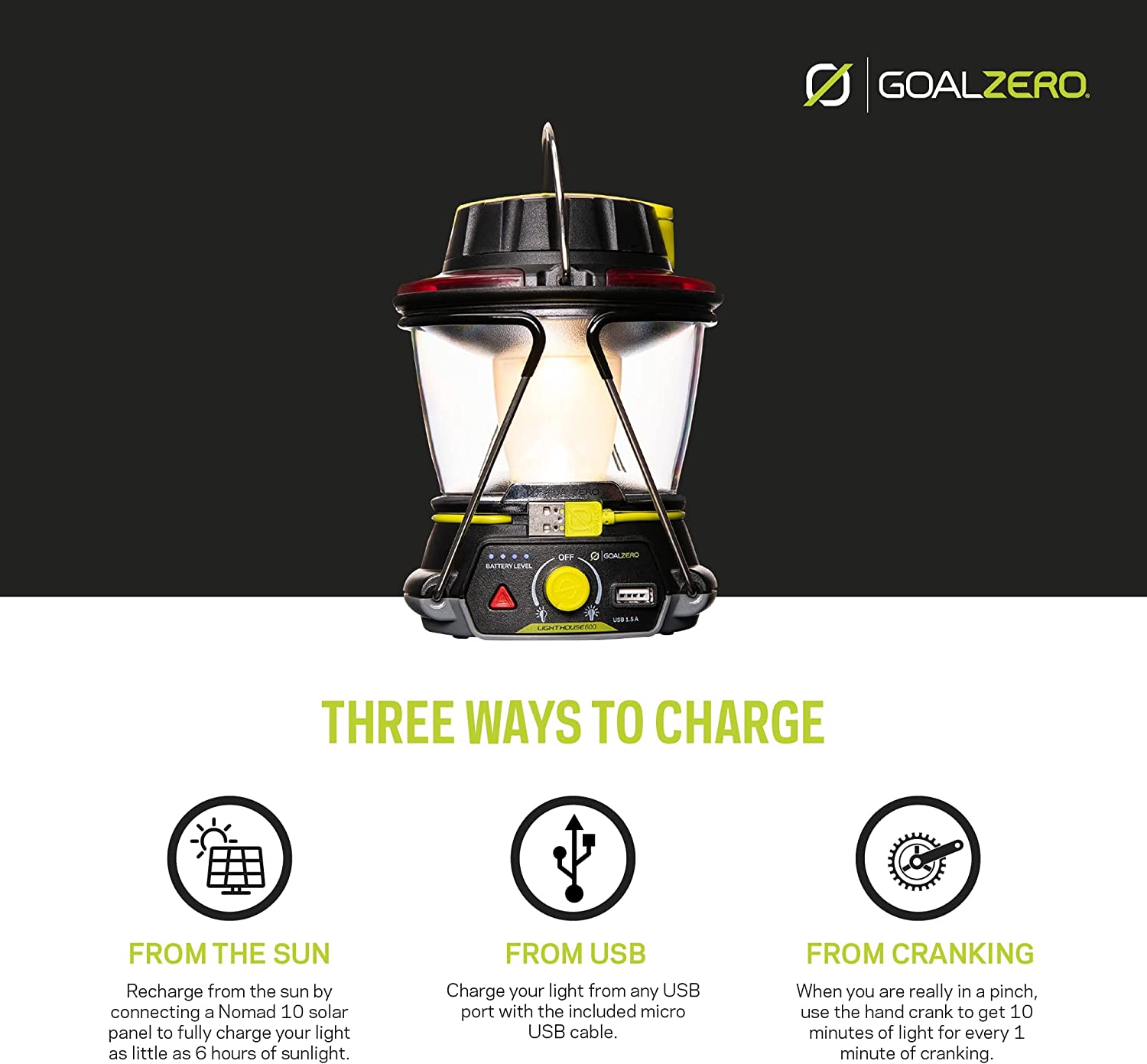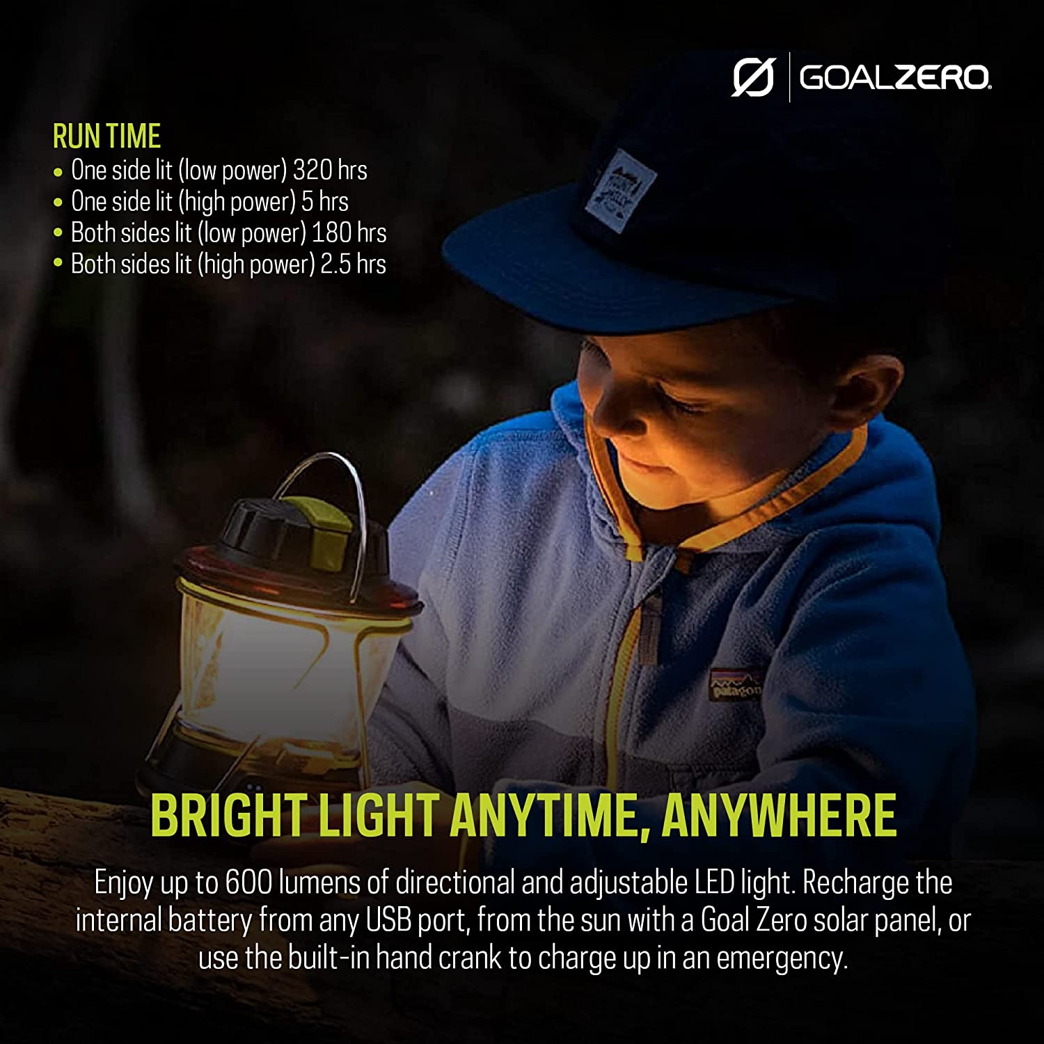 • 3 WAYS TO CHARGE: Recharge the internal lithium 5,200-milliampere-hour battery using any USB port, using the sun with a Goal Zero solar panel (not included), or using the built-in hand crank during an emergency. Crank the lantern for 1 minute to power the light for 10 minutes on a low setting.