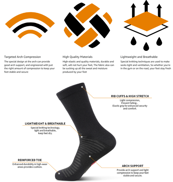 [ARCH SUPPORT FOR YOUR FEET] The arch of the foot area is designed with a triangle-like pattern to provide support for the medial and lateral sides of the foot. Targeted arch compression keeps your arch stable and secure. Perfect for everyday use and boost your performance for any sports activity, yoga, gym, cycling, running, walking, standing, travel, or just sitting on the couch