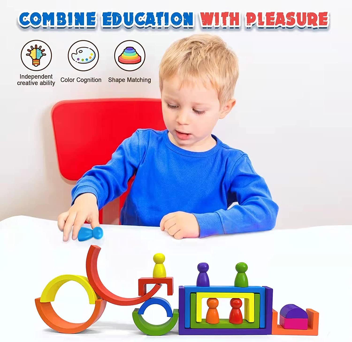 • ?【Wooden Toys For Toddler】:These wooden blocks total 19PCS.Including 7 square rainbow blocks,6 arc wooden blocks, and 6 small doll shape blocks. Encourage children to use their imagination, create a variety of shapes.