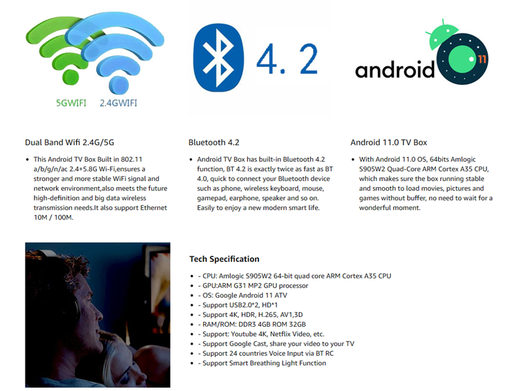 - The powerful Android 11.0 system and Amlogic S905W2 chip allow you to enjoy faster, clearer, and high-quality visual impact.