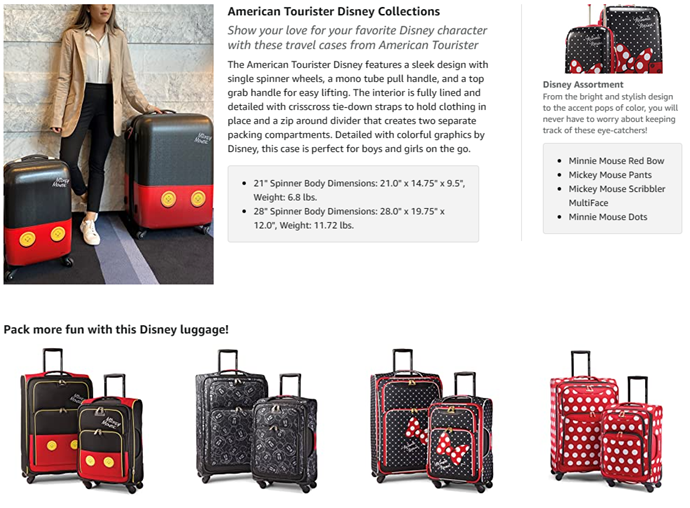 Show your love for your favorite Disney character with this hardside upright travel case from American Tourister. The American Tourister hardside is made from lightweight and durable ABS material and features a sleek hardside design with side-mounted skate wheels, a mono tube pull handle, and a top grab handle for easy lifting. The interior is fully lined and detailed with crisscross tie-down straps to hold clothing in place and a zip around divider that creates two separate packing compartments. This case is perfect for boys and girls on the go. Pack more fun with this Disney luggage!