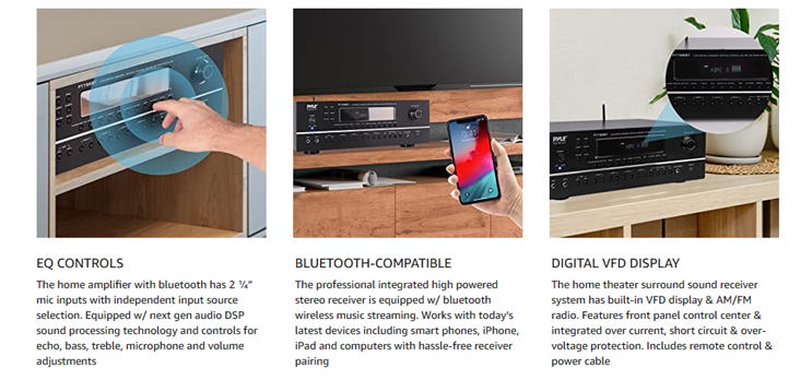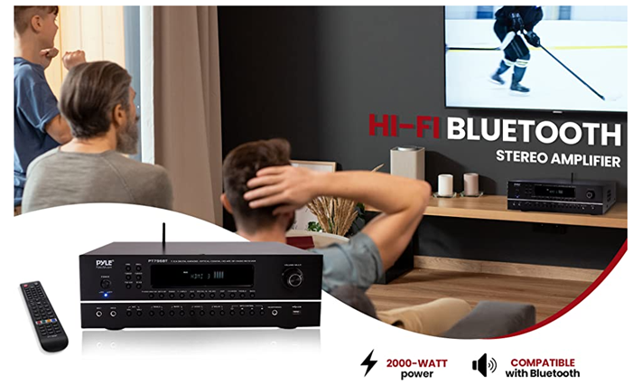 Features: - 7.1 Channel Receiver System - AV (Audio/Video) Stereo Amplifier - Hi-Fi Home Theater Surround Sound - Built-in Bluetooth Wireless Audio Streaming - Next-Gen Audio DSP Sound Processing Technology - 4K Ultra HD TV Pass-Through Support - 3D Video & Blue-Ray Video Pass-Through Support - Digital Dynamic VFD Display with AM/FM Radio - Connect & Stream Audio from External Devices - MP3 Digital Audio Support - USB Flash Drive Reader - Connection Interface: (3 IN+1 OUT) x HDMI, RCA (L/R), Speaker Binding Posts, Optical / - COAX Digital Audio - HDMI Output + Dedicated RCA Subwoofer Output - (2) 1/4’’ -inch Microphone Inputs - Independent Input Source Selection - Digital Graphic Audio Output Level Display - Mic Echo, Bass, Treble, Volume Control Adjustment - Over Current, Short Circuit, and Over Voltage Protection Wireless Bluetooth Connectivity: - Simple & Hassle-Free Pairing - Instantly Receives Wireless Music Streaming - Works with all of Today’s Latest Devices - Smartphones, Tablets, Laptops, Computers, etc.) - Bluetooth Version: 5.0 - Bluetooth Network Name: ‘PYLE PRO’ - Wireless Range: 30’+ ft. What’s in the Box: - AV Receiver - Remote Control - Power Cable Technical Specs: - Power Output: 2000 Watt MAX - Amplifier Receiver Type: 7.1-Channel - Speaker Impedance: 4-16 Ohm - S/N Ratio: >80dB - T.H.D.: <0.05% - Radio Station Memory: 30 Presets - Digital Audio File Support: MP3 / WMA/APE/FLAC - Maximum USB Flash Support: Up to 1TB - Battery Operated Remote Control, Requires (2) x ‘AAA’ Batteries, Not Included - Power Cable Length: 3.9’ ft. - Power Supply: 115V/240V, switchable - Total Unit Dimensions (L x W x H): 16.9’’ x 13.8’’ x 5.5 ’’ -inches.