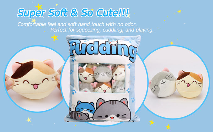 You could not miss this ultra-soft pudding plush pillow with a bag of fluffy stuffed animals!!!