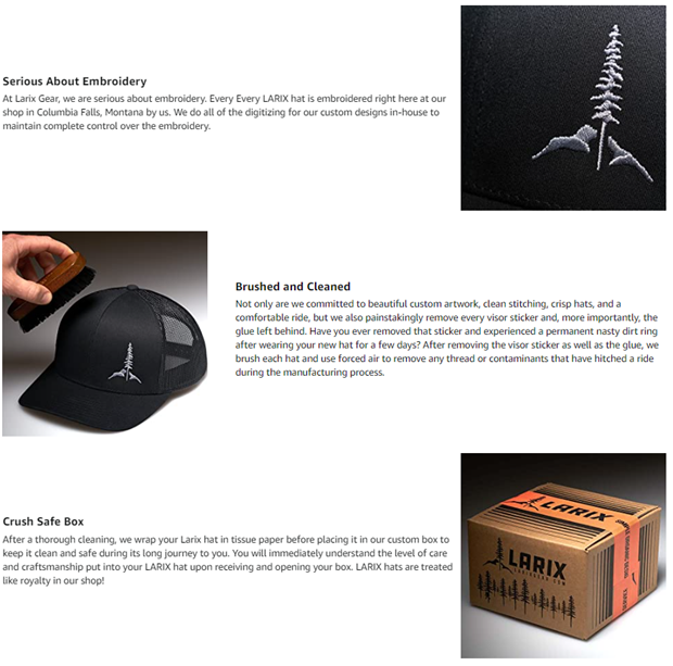 - SERIOUS ABOUT EMBROIDERY : Every Larix hat is embroidered right here at our shop in Columbia Falls Montana by us. It's our highest priority to achieve outstanding results by using the most advanced sewing technology and techniques available today.
