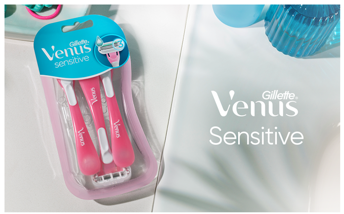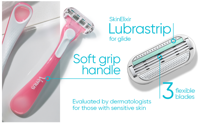 Our Gillette Venus Sensitive disposable razor for women is a 3 bladed razor designed for women with sensitive skin. This razor features 3 blades for a smooth shave and a SkinElixir lubrastrip that releases a perfect dose of protection you can feel.