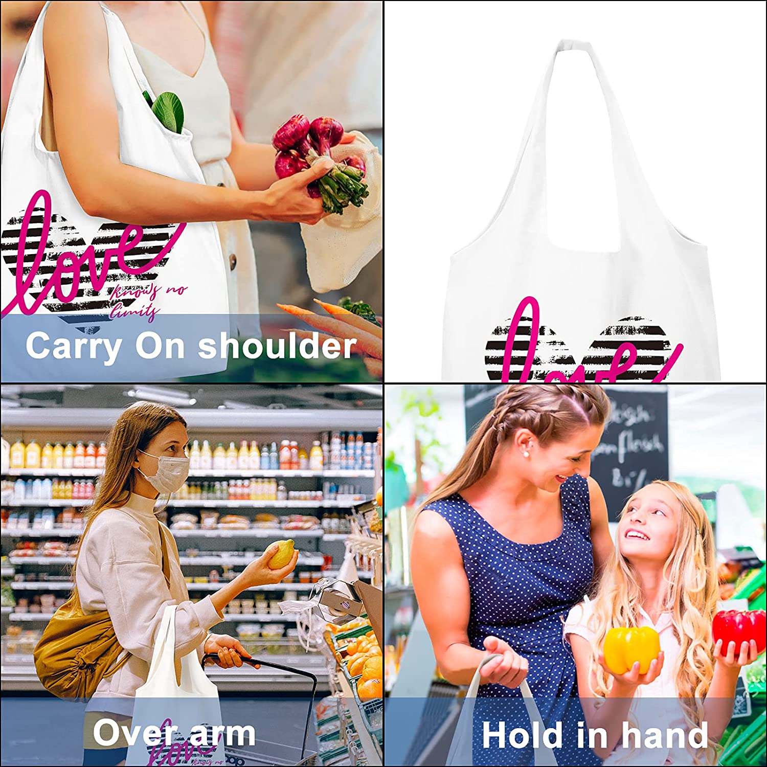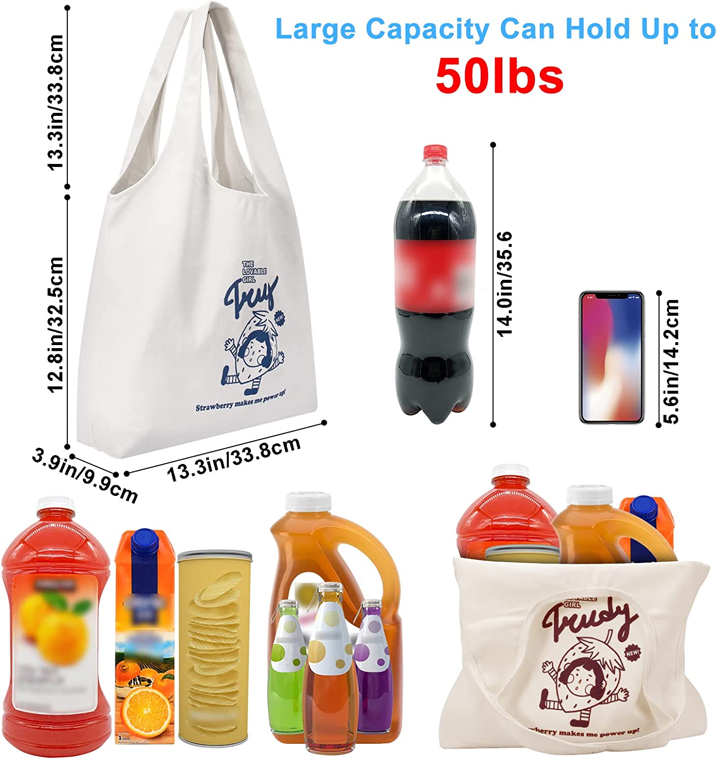 • X-Large Capacity: Canvas tote bags are very big which can hold up to 50+ pounds of groceries and replaces 2-3 conventional grocery bags. Long handles of the reusable shopping bags allow for hand holding or carry on the shoulder for easier carrying. The foldable aesthetic tote bag is perfect for shopping, groceries, travel, storage and practical for daily use.