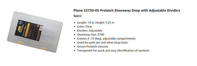 Compartment box, number of compartments 4 to 15, number of removable dividers 22, overall width 14 in., overall height 3-1/4 in., overall depth 9-1/8 in., material polypropylene, color clear, latch type Prolatch, latch color yellow, includes 4-15 adjustable compartments.