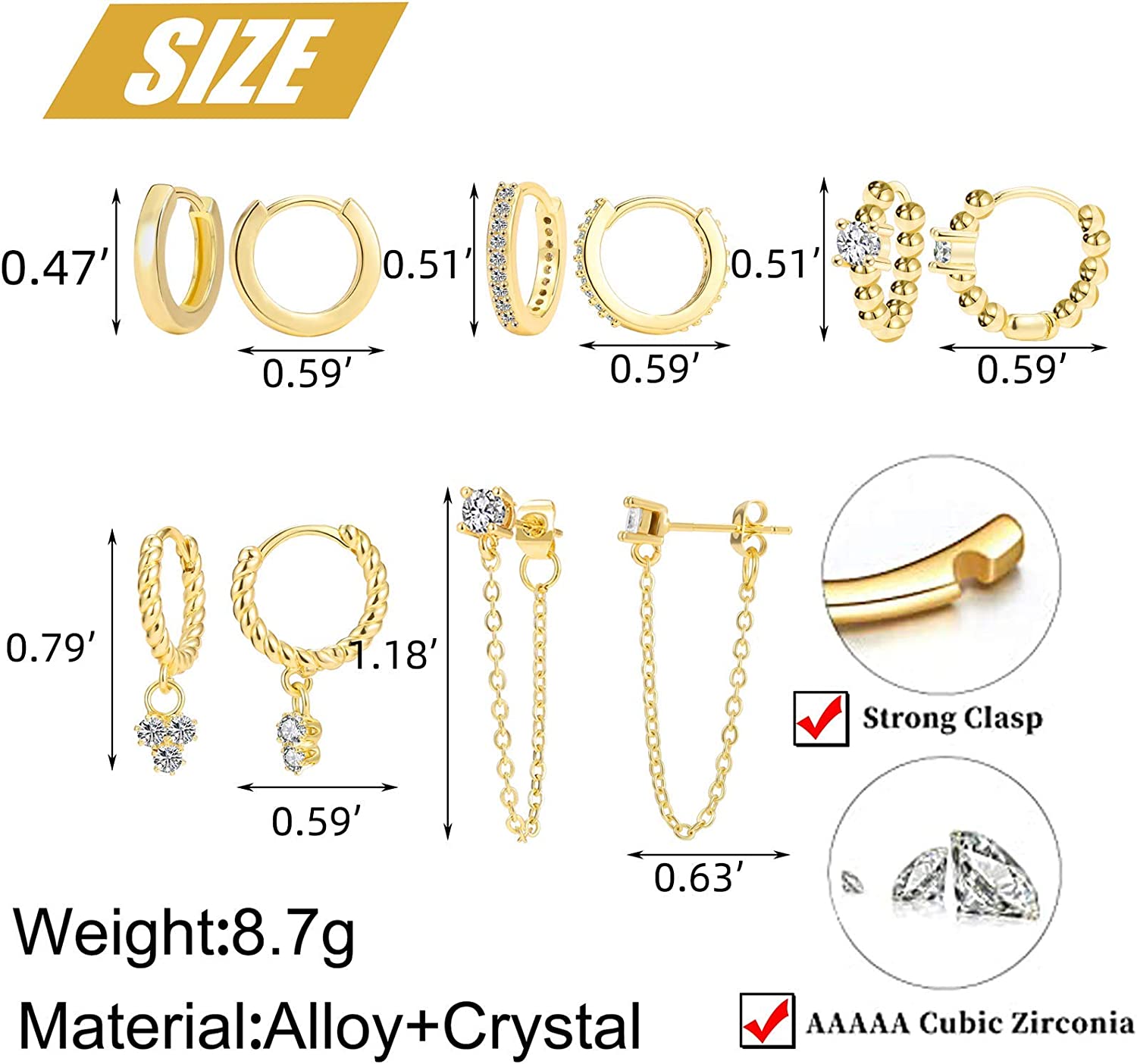 • ?Various Styles?- One order includes 5 pairs huggies hoop earrings set, which means a pair of small hoop earring + a pair of cz huggies hoop earring + a pair of cz beaded hoop earring + one pair of cz dangle twisted earring + one pair of chain cuff earring. Suitable for all ages making you elegant and sexy every moment.