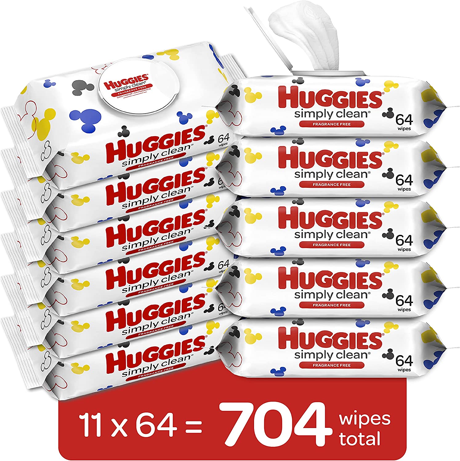 Baby Wipes, Unscented, Huggies Simply Clean Fragrance-Free Baby Diaper Wipes, 11 Flip Lid Packs (704 Wipes Total)
