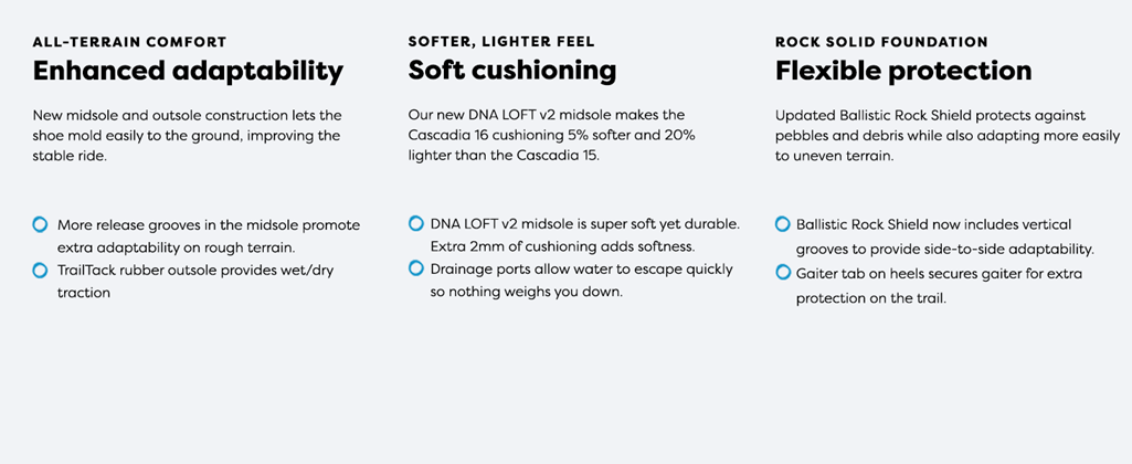 • THIS WOMEN'S SHOE IS FOR: Trail Runners who want to explore and feel protected on changing terrain. This shoe is made to adapt quickly so runners stay comfortable and stable. Predecessor: Cascadia 15