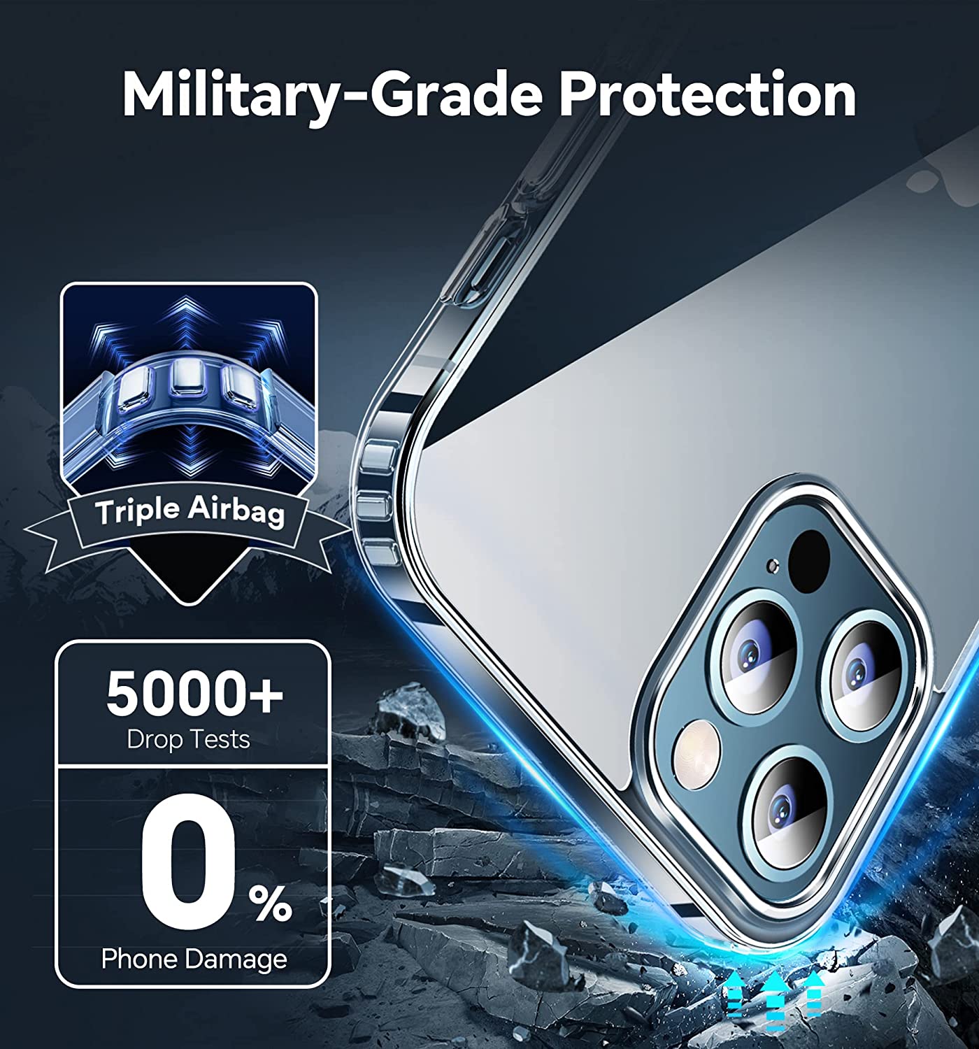 • Military Grade Shockproof Protection: Our case is equipped with 12 built-in airbags at the four corners, which can effectively cushion the phone in the event of a drop or impact. The back plate adopts a composite sheet of rigid polycarbonate and polymethyl methacrylate combination to ensure transparency and hardness while improving crack resistance. The anti-fall capability reaches the U.S. military-grade standard.