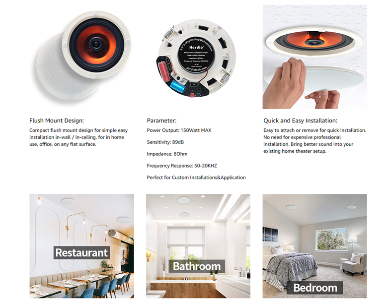 • Flush Mount Design - Wide sound dispersion designed speakers easily integrate with new and existing audio systems, traditional Passive speaker design, simply drive power from your home audio receiver or amp