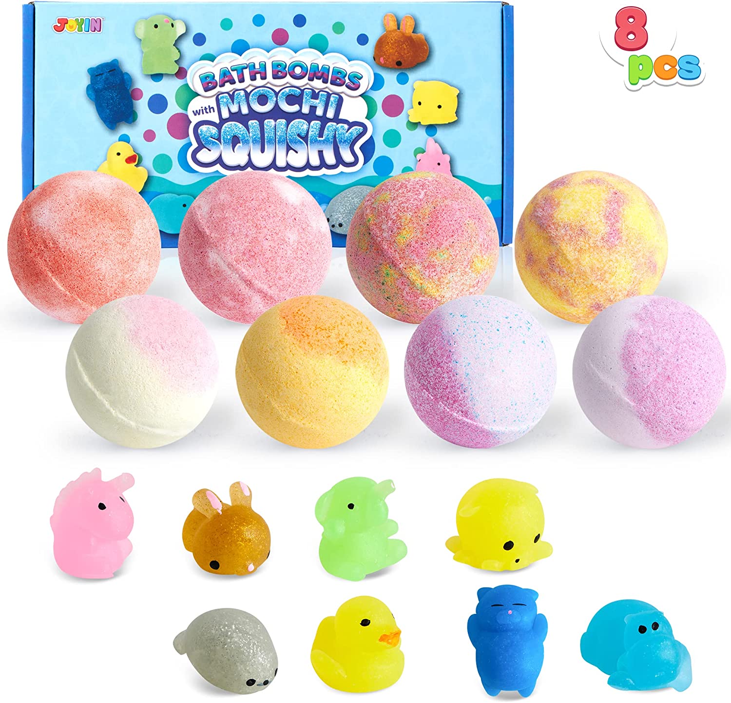 JOYIN Bath Bombs with Glitter Mochi Squishy for Kids, 8 Packs Bubble Bath Bombs with Surprise Toy Inside, Natural Essential Oil SPA Bath Fizzies Set, Easter Gifts for Boys and Girls