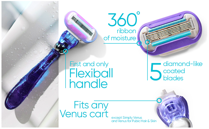 • Gillette Venus Flexiball pivots to contour to your body for a flawless shave