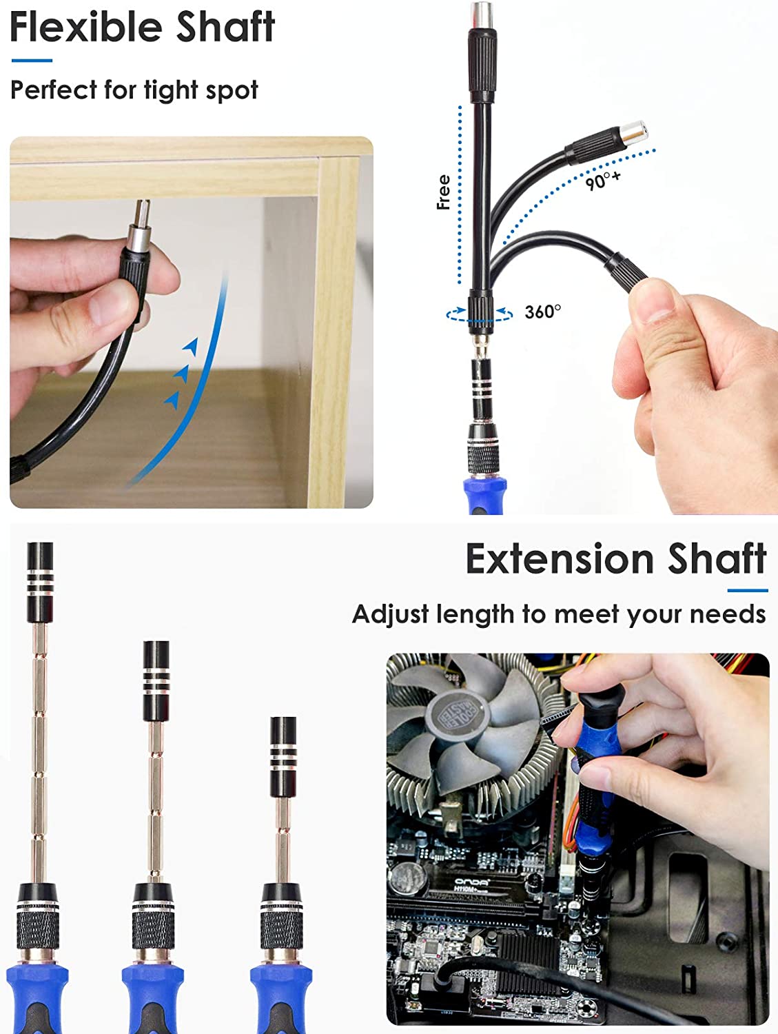 - 【Practical Accessories】The magnetizer demagnetizer tool can adjust the magnetism of the bits, strong magnetism for grabbing screws, and weak for protecting sensitive electronics. One flexible extension shaft helps to reach tight spot. The 1/4" to 4mm driver adapter allows the bits to be used by electric screwdriver. The opening picks and spudger help you open tech devices and safely remove components with ease