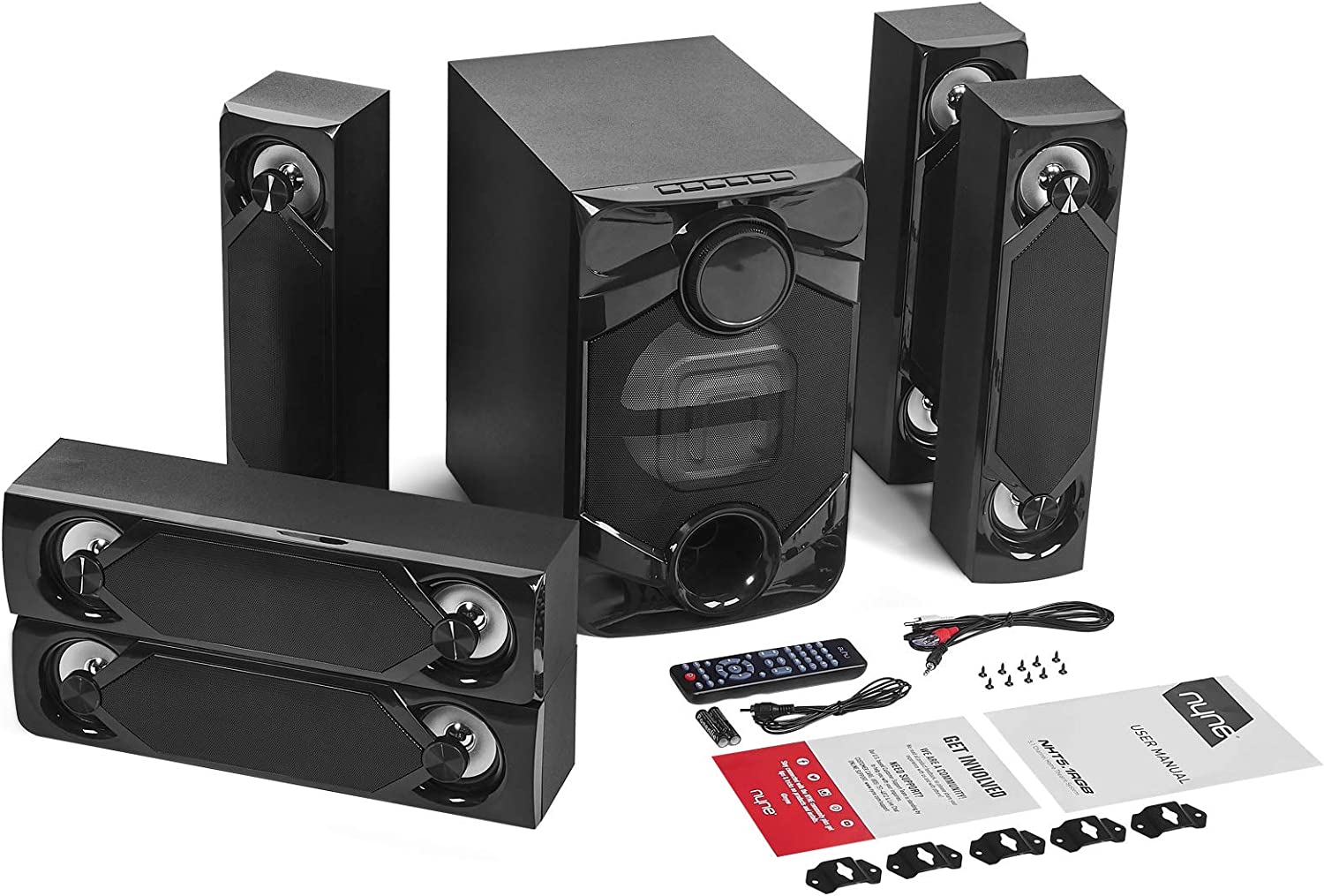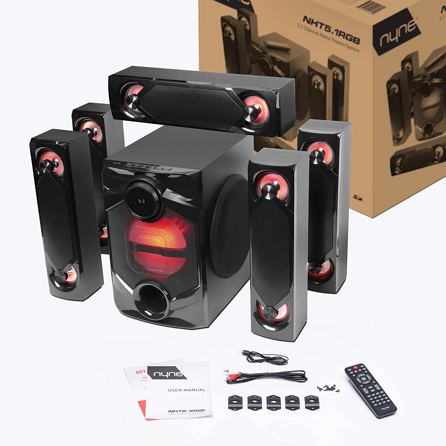 Nyne NHT5.1RGB 5.1 Channel Surround Sound Home Audio Theatre System – for TV, Bluetooth, LED, USB, SD, RCA Out in, 8 Inch Active Subwoofer, 6 Inch Passive Radiator, Soundbar, Cinema Acoustics