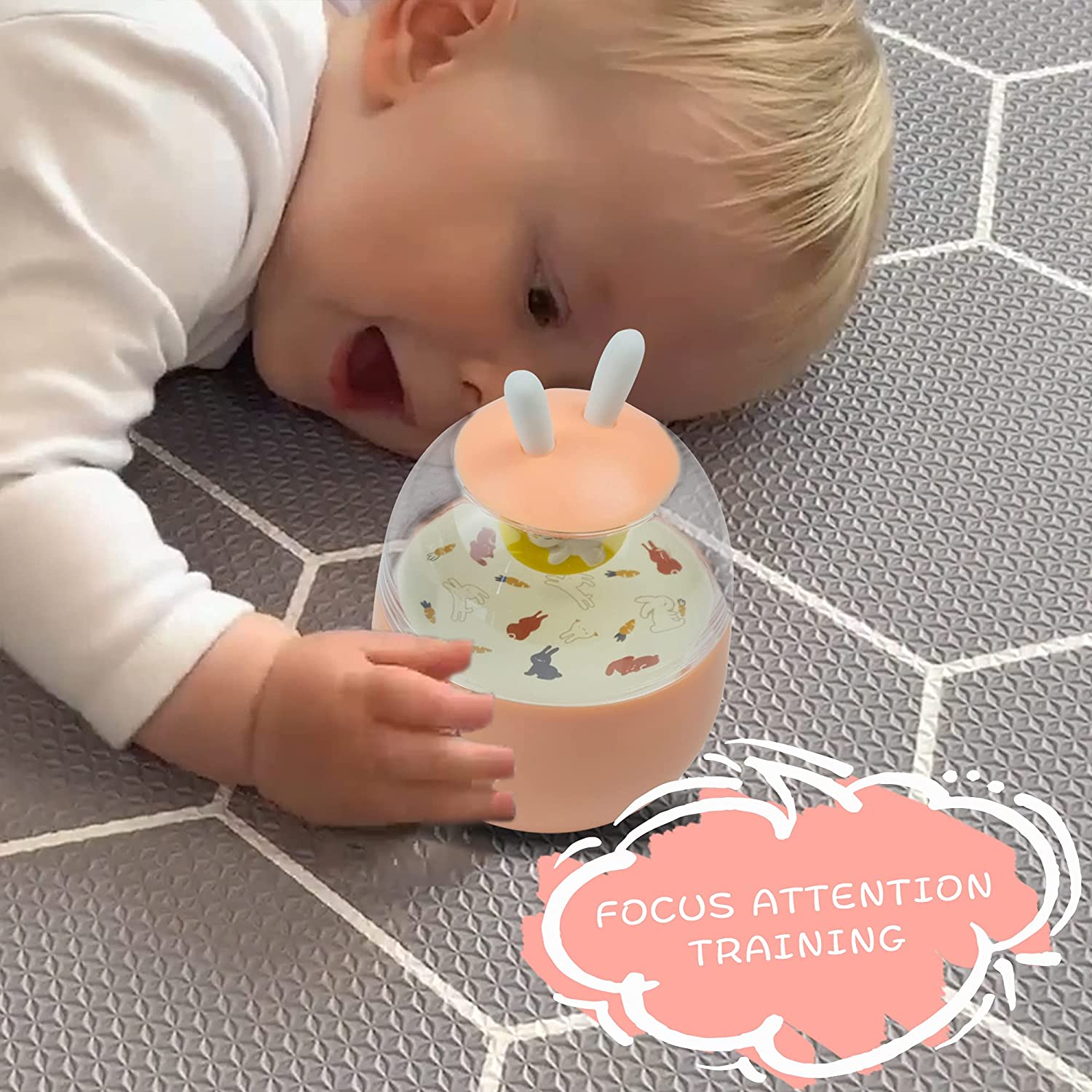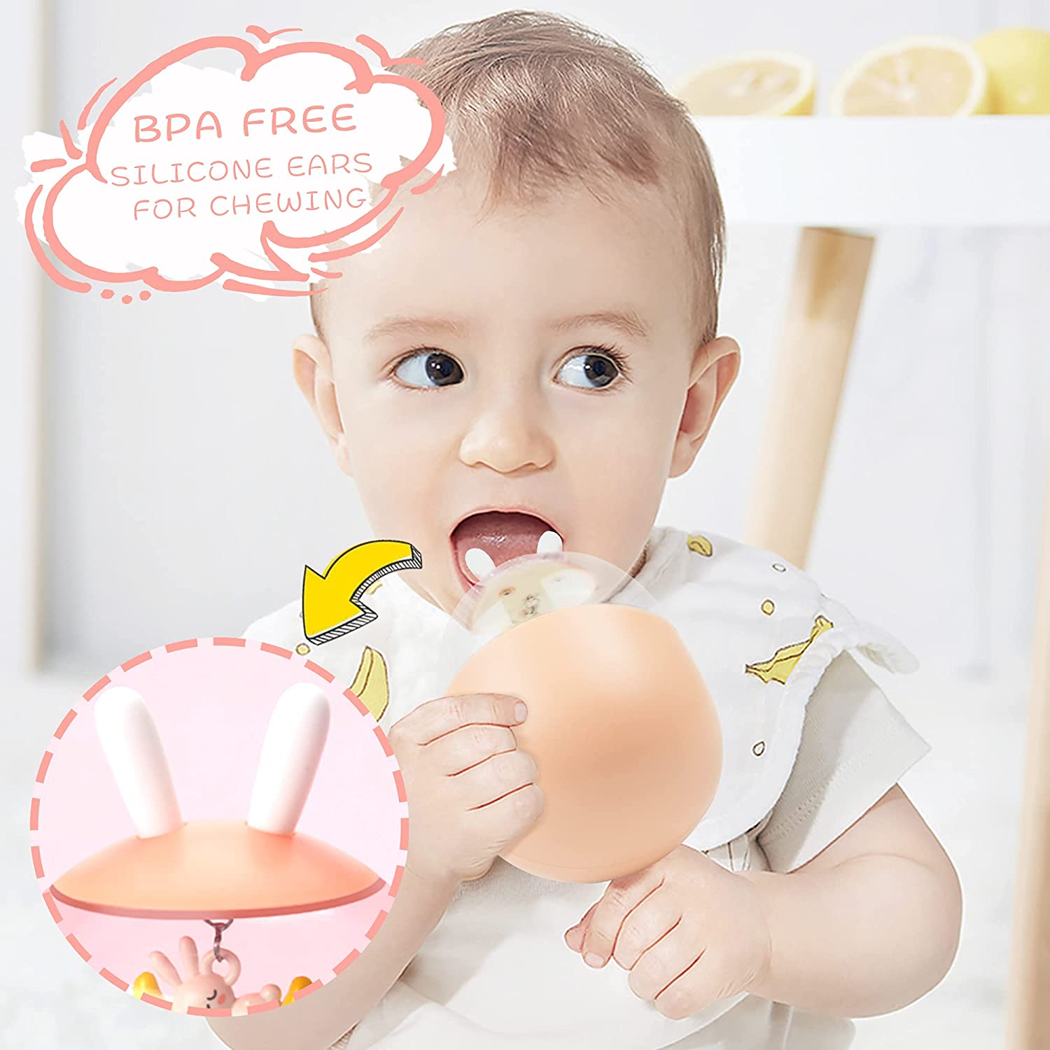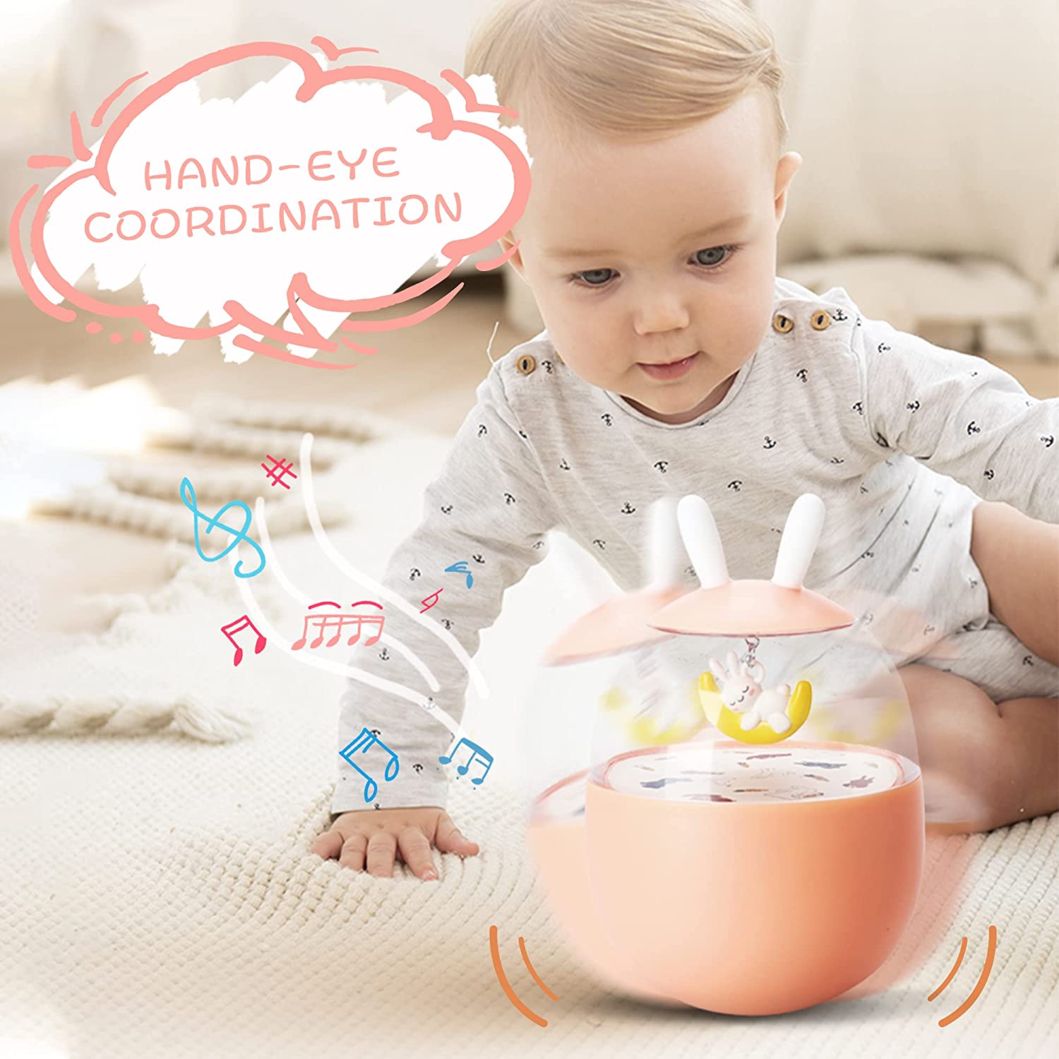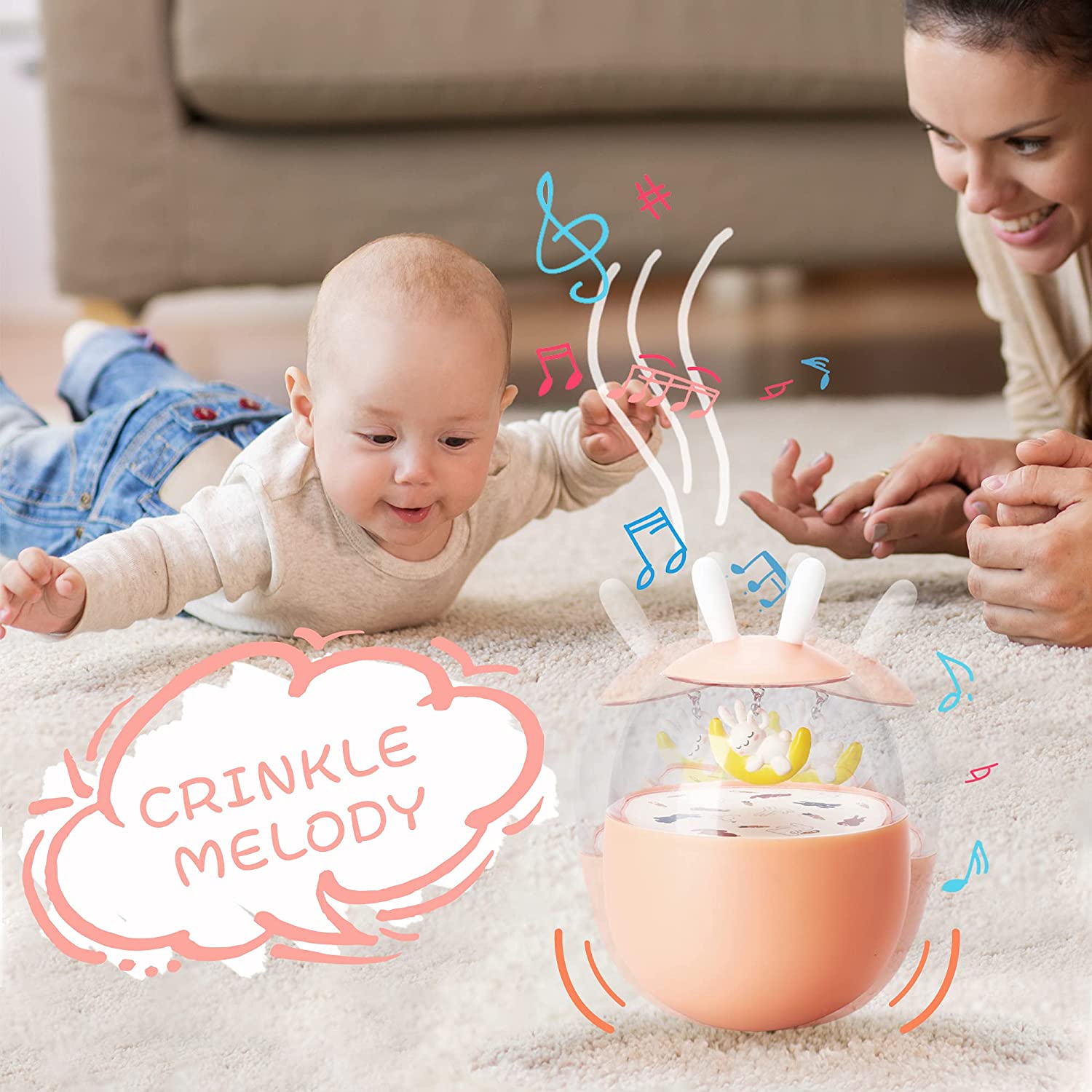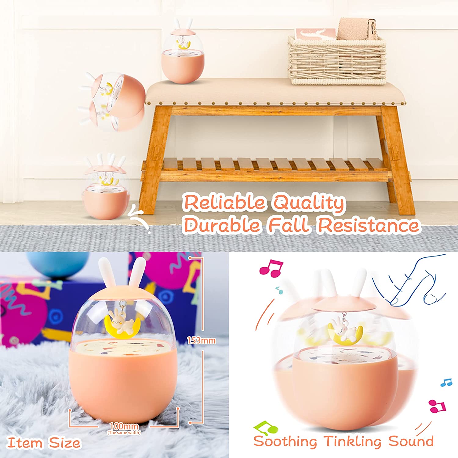 • 【Cute Design】The round body, transparent space live in a cute whale/sleeping bunny would swing and make wind chimes when you push it, which would contract the babys' attention. The "ear" on the top fits for the baby to grasp or molar the teeth.