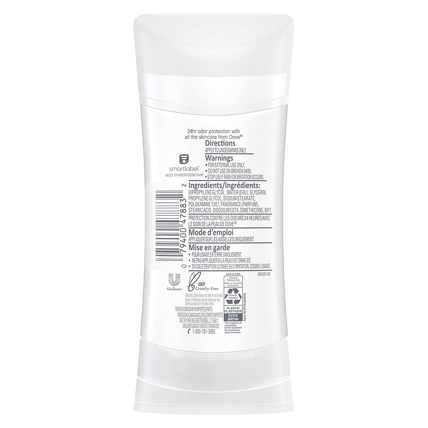 • This deodorant is caring to skin. It contains 1/4 moisturizers to provide great underarm care. You can also trust that Dove is certified cruelty-free by PETA.