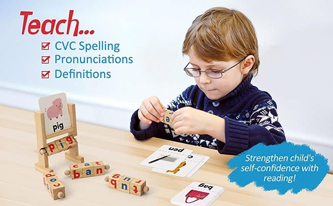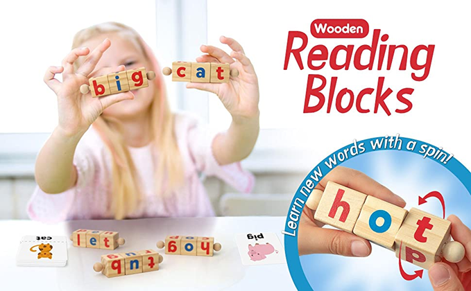 - Wooden Spelling Toy: Includes a wood tray, 5 Handheld Sets of Rotating Blocks with 3-letter word movable blocks. Along with 48pcs sight words flash card (24 pcs foldable word 2-in-1 cards, 24 pcs word cards). Appropriate for teaching very basic reading skills.