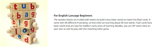 - The cards have basic words that are easy for toddler’s early years of learning. It can help your kid’s spelling, matching and memory skills, to match letters on the cubes with letters on word and spell the letter name of the object.