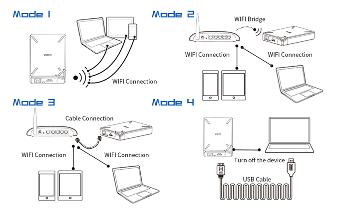 Mode 1 Allows for wireless connection of phones / tablets / computers to the SSK Drive WITHOUT having any internet connection via the SSK Cloud App and the built in wi-fi.