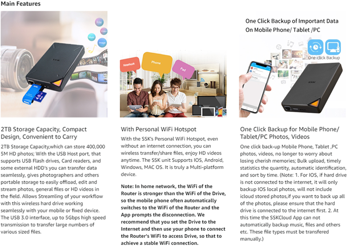 ⒈Mobile phone/Tablet PC/Computer connect the Hard drive’s WiFi hotspot; ⒉Mobile phone/Tablet PC/Computer access the Hard Drive via SSKCloud App/Software; 3. All devices have no internet connection.