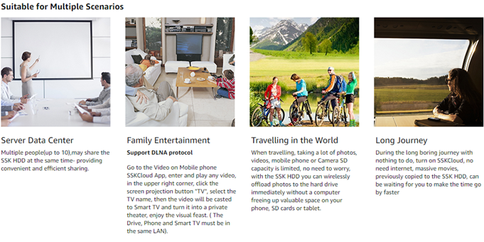 • Smart Control: Smart App(IOS & Android supported), smart upload/download, one Click backup, remote access easier. Supports multi-people sharing at the same time; Supports Samba and DLNA Protocol, all smart devices interconnection in the LAN, smart TVs, laptops and mobile phones can share SSKCloud data freely; Divide hard drive to Private Area and Public Area to better retain private information and improve security; One Click backup On Mobile Phones, Tablets and PCs