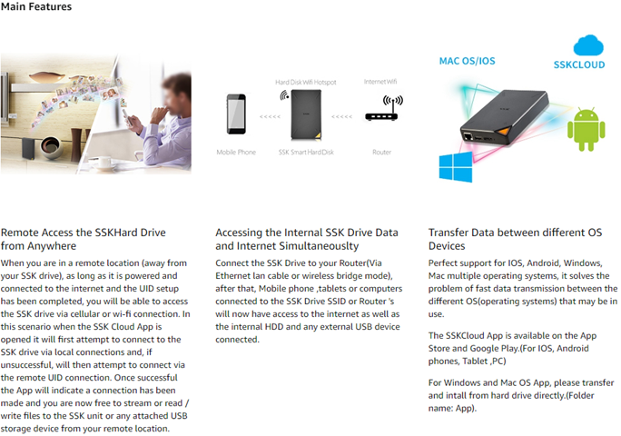 OS Supported: Android, IOS, Windows and Mac OS, all have corresponding App/Software.(Note: The SSKCloud App doesn't support Chrome OS& Kindle Fire currently)