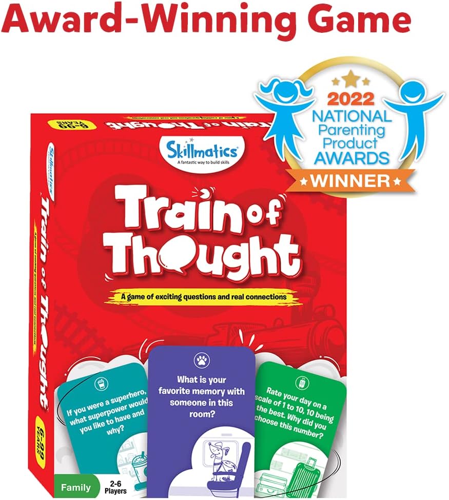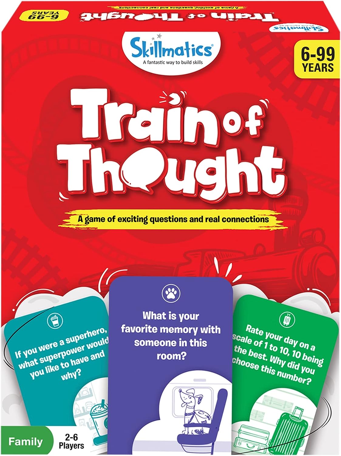 TRAIN OF THOUGHT CARD GAME - Train of thought is the perfect parental tool to approach playtime and family time. This highly engaging, age-appropriate game of exciting questions & fun challenges can be enjoyed by all ages.