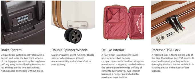 Named after the famous central district of Paris, this timeless and elegant spinner luggage, Chatelet Air, offers leather-like accents as well as a deluxe interior. It is made from virgin polycarbonate formulated to achieve the highest standards of extreme temperature and impact resistance. Established in 1946, Delsey has used its flair to marry tradition with innovation, elegance with modernity and design with practicality. We design tomorrow's luggage with inspiration from many places: travelers and their journeys, societal changes and the evolving environment. As a result our luggage keeps getting lighter, better fitted and more environmentally friendly. Enabling our customers to travel elegantly and limiting any negative impact on the environment is our raison d’être.