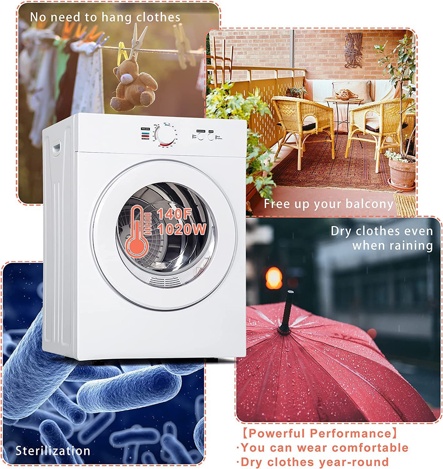 - 【High performance】This is powerful yet compact clothes dryer machine, euhomy portable dryer has a large capacity of 10.5 pounds(wet clothes). This dryer with 1050W power, It can reach a maximum temperature of 140°F, To ensure that your clothes dry quickly. Note: Use after spin-drying, the drying effect is better./The dryer can serve two people/If you have more space needs, you can buy other products of this brand.