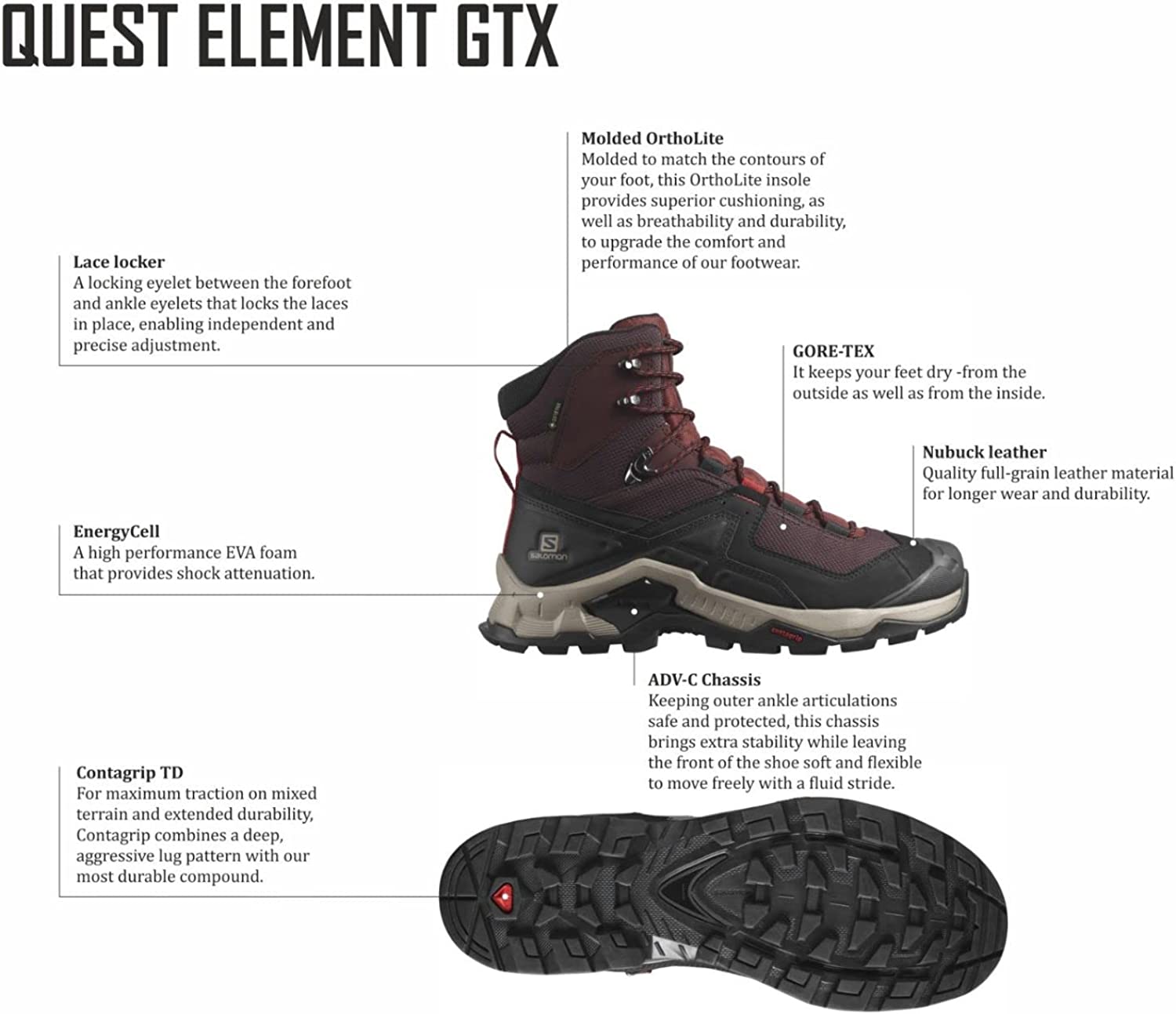 • When wild places and unknown paths call, you need a backpacking shoe designed for adventures. With premium Nubuck leather, GORE-TEX protection and a higher cut, the QUEST ELEMENT GTX protects you from obstacles and the elements. While the lightweight construction and stabilizing chassis keep you agile at every step.