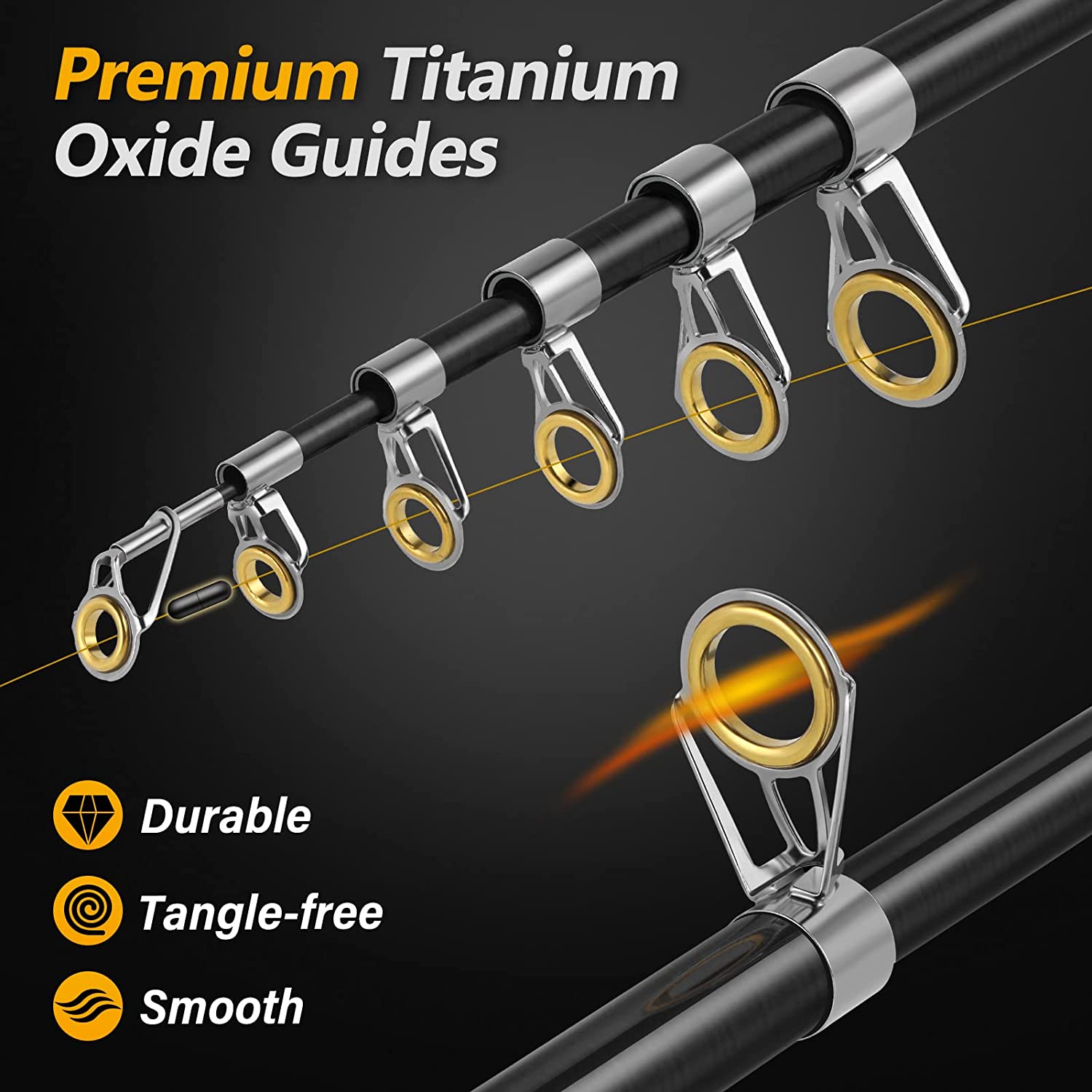 • 【Super Smooth Power】Stainless steel guides with Ceramic inserts makes it more smooth and durable, avoids line sticking into the guides, minimizes friction while also enhancing sensitivity by transferring vibrations from the line through the guide to the rod and to your hand.