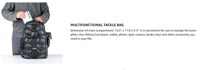 - 【MULTIFUNCTIONAL TACKLE BAG】-The dimensions of the main compartment are 16.5” x 11.8”x 5.5”. Our Plusinno backpack & sling bag is plenty large enough for you to store your favorite fishing gear, lures and lure boxes, pliers, line, wallet, phone, keys and any other accessories you want to keep safe and close to you while out and about in the great outdoors.