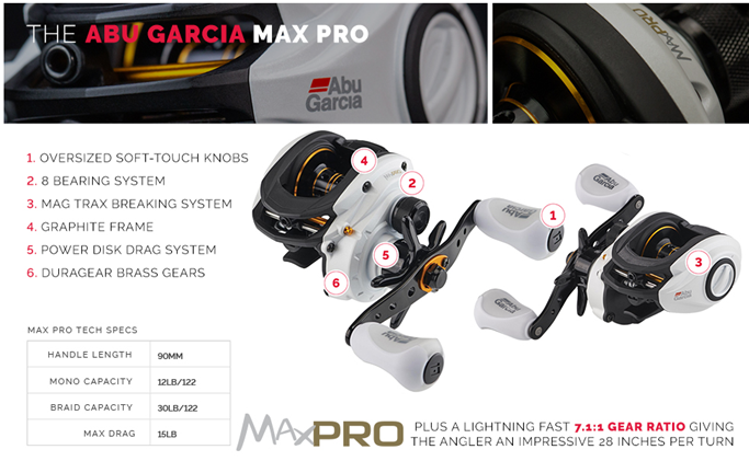Experience better-than-ever Abu Garcia engineering with MAXimum performance with the Abu Garcia Max Pro baitcast reels. These reels feature custom designed, co-molded handle knobs for increased comfort, a 7+1 bearing system for ultimate smoothness, and Duragear™ Brass gear for durability.