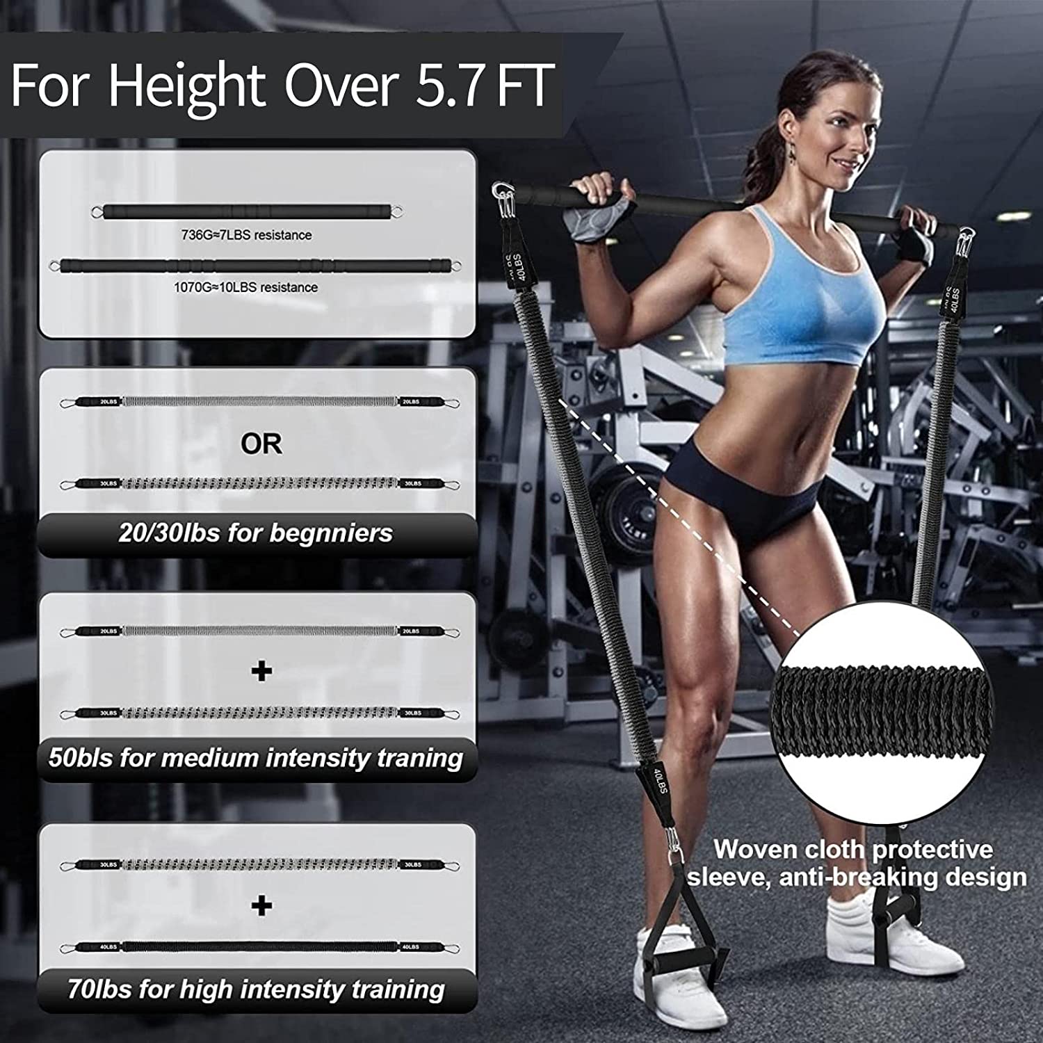 ✅『Customize Your Workout』WeluvFit Pilates Bands are length/resistance adjustable. Just 4 steps: Loose-Takeout-Adjust-Lock, then you can increase or decrease the bands' length/resistance for your strength training according to height,weight,fitness level,and age group. It comes with 4 length adjustable bands(2pcs strong, 2pcs standard, or 4pcs mixed-use), varying in resistance 20-40-60 pounds. Pilates bars are ideal home fitness equipment for men and women and the option burning calories faster.