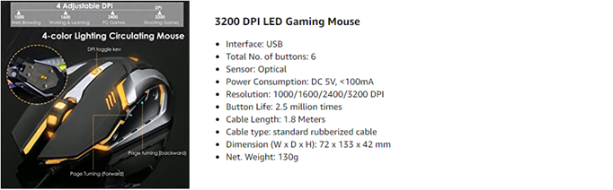 - 3 level adajustable mouse sensitivity DPI: 1000/1600/2400/3200 DPI