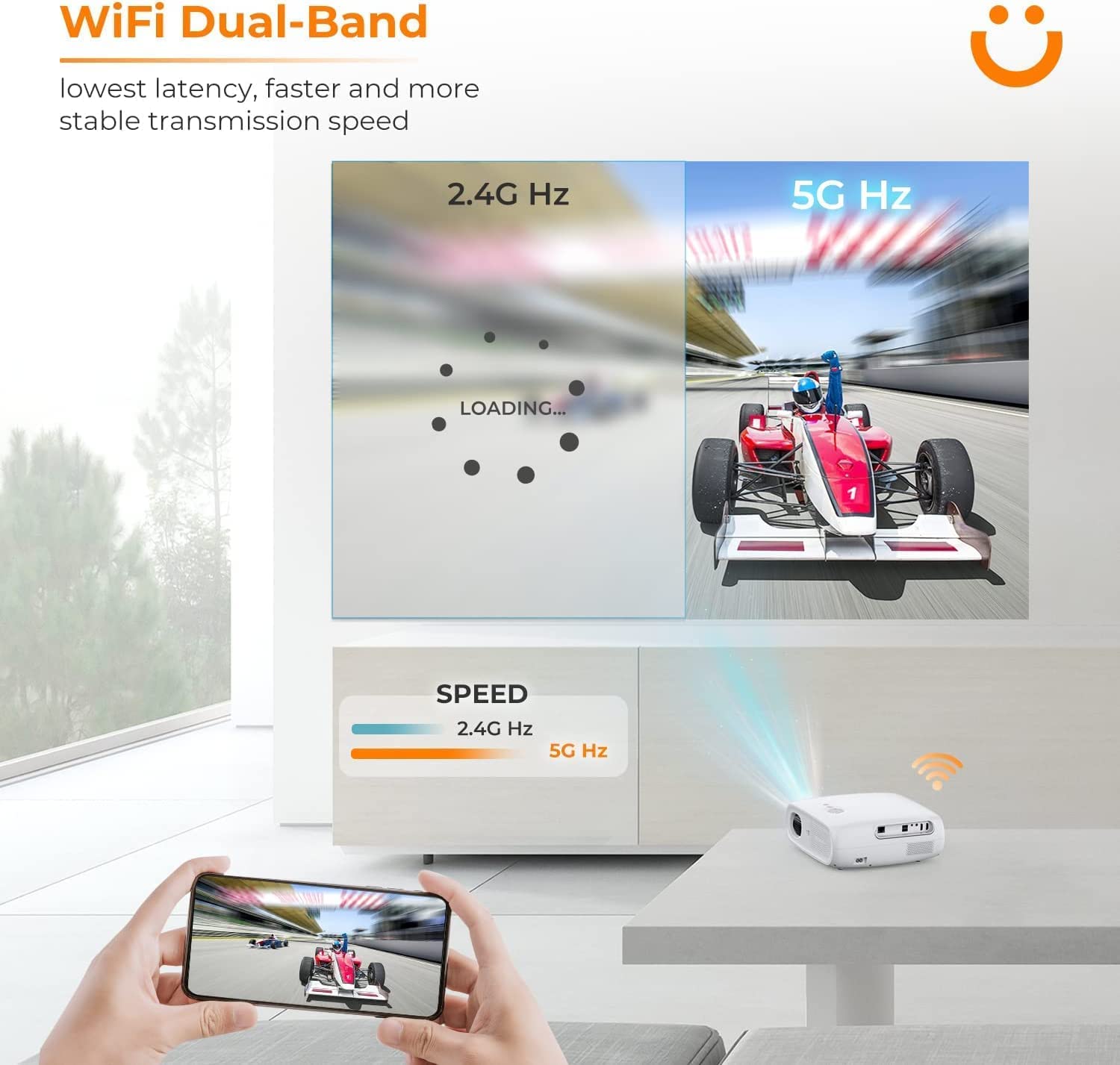 YABER Pro V7 is the first one projector after the upgrade of the YABER brand. With these three innovative functions: Unique Auto 6D Keystone Correction(allows V7 to automatically correct to a rectangle under any trapezoid)5GHz/2.4GHz WiFi dual-band and +25% Brighter than all other 1080P LCD projectors. It adopts YABER innovative BASIC Smart Engine, advanced German LED light source and delicate manufacturing process. 1920*1080P Native resolution, 12000 L brightness, 15000:1 contrast, the 350" large screen of the YABER Pro V7 projector has excellent image size, rich, brilliant colors and impressive Deeply incredible sound effects.