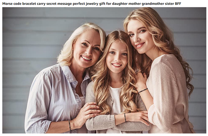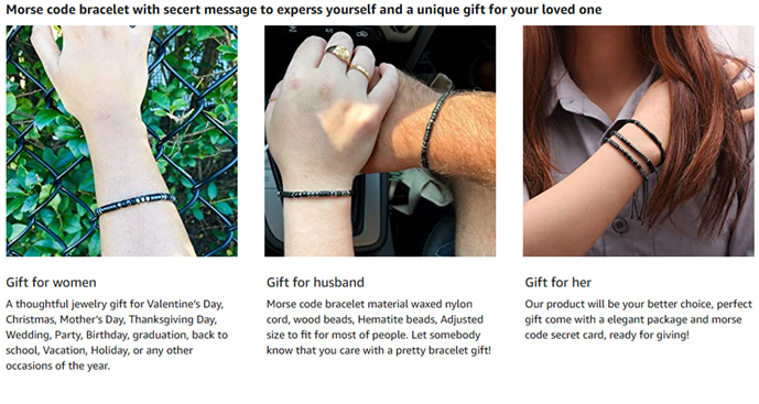 The stainless steel bead on the bracelet represents a "dot" in code, and the hematite bead represents a "dash".