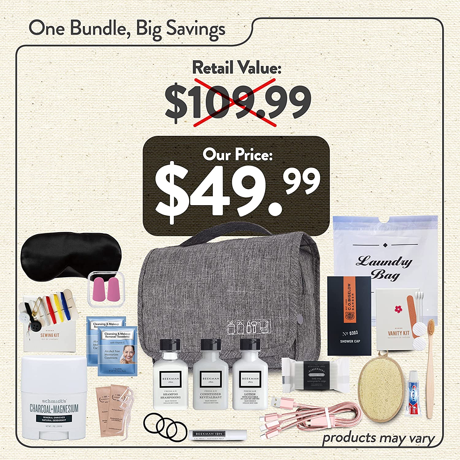TSA COMPLIANT TRAVEL KIT INCLUDES: Large Capacity Toiletry Bag with Hanger, Extra Long (6.5 ft) Multi Phone Charger, Shampoo and Conditioner, Soap, Sponge, Body Lotion, Deodorant, Sleep Mask, Earplugs, Sanitizing Wipes, Bamboo Toothbrush, Toothpaste, Floss Picks, Makeup Remover Wipes, Laundry Bag, Sewing Kit, Cotton Pads, Q-tips, Nail File. Travel essentials and Travel-Size Toiletries for grooming, hygiene, oral care and comfort for women.
