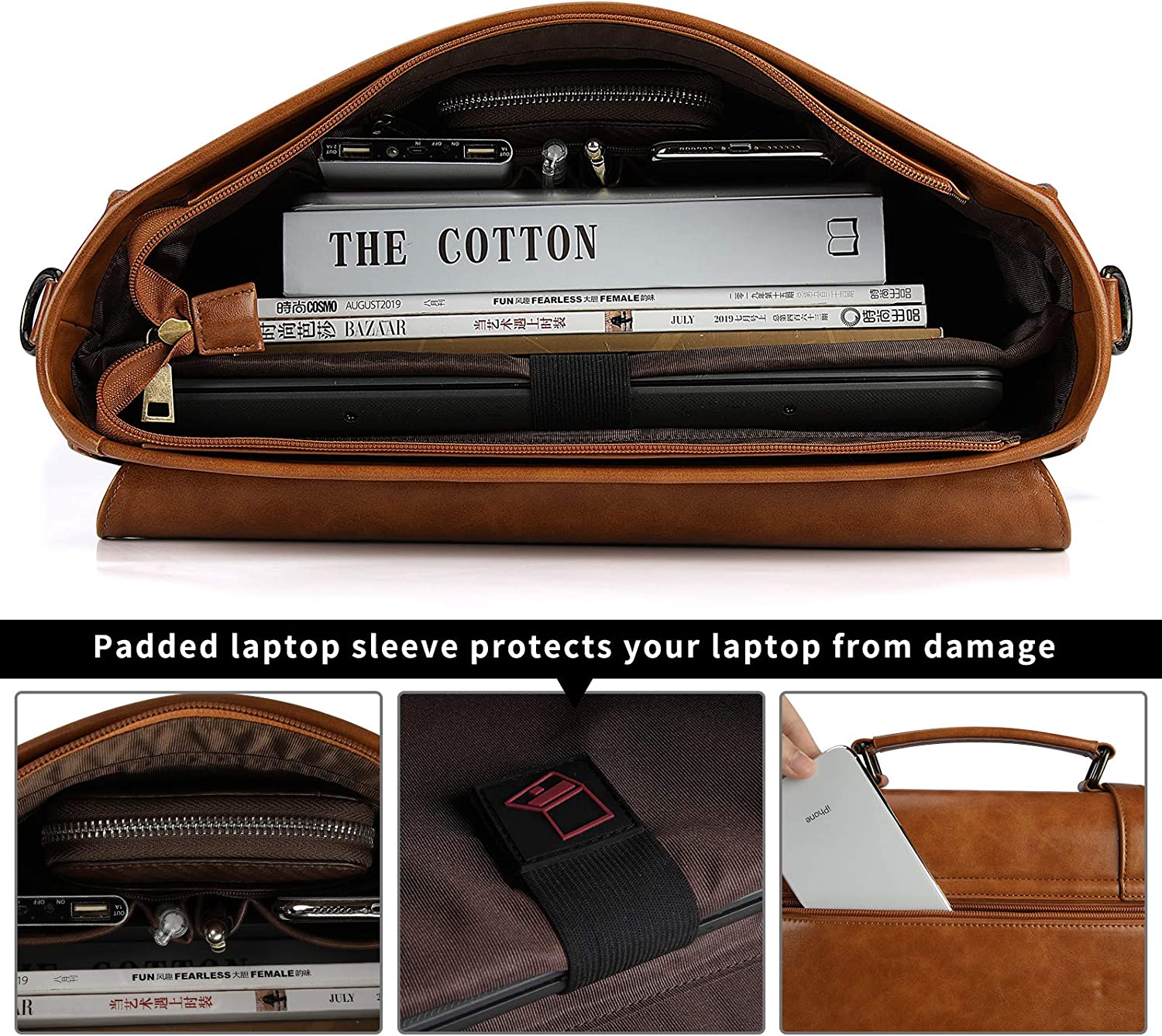 - 【Convenient Magnetic Snap & Comfortable Fit】Laptop messenger bag is double secured by magnetic snaps and zippers. Inner padded laptop sleeve fits most laptops up to 15.6" and cohesive seal ensures it to be steady.