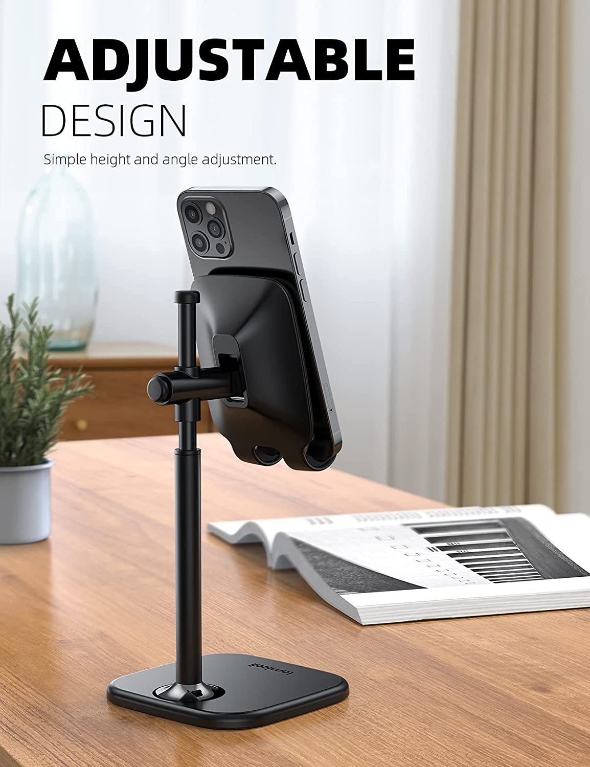 【Height Angle Adjustable】The Upgraded Lamicall phone stand can adjust the height from 159-205mm (6.25-8.07 inches). Easily adjust it to the height as you like by sliding the bar smoothly. 60 degrees angle adjustment provides a comfortable angle as you willing.