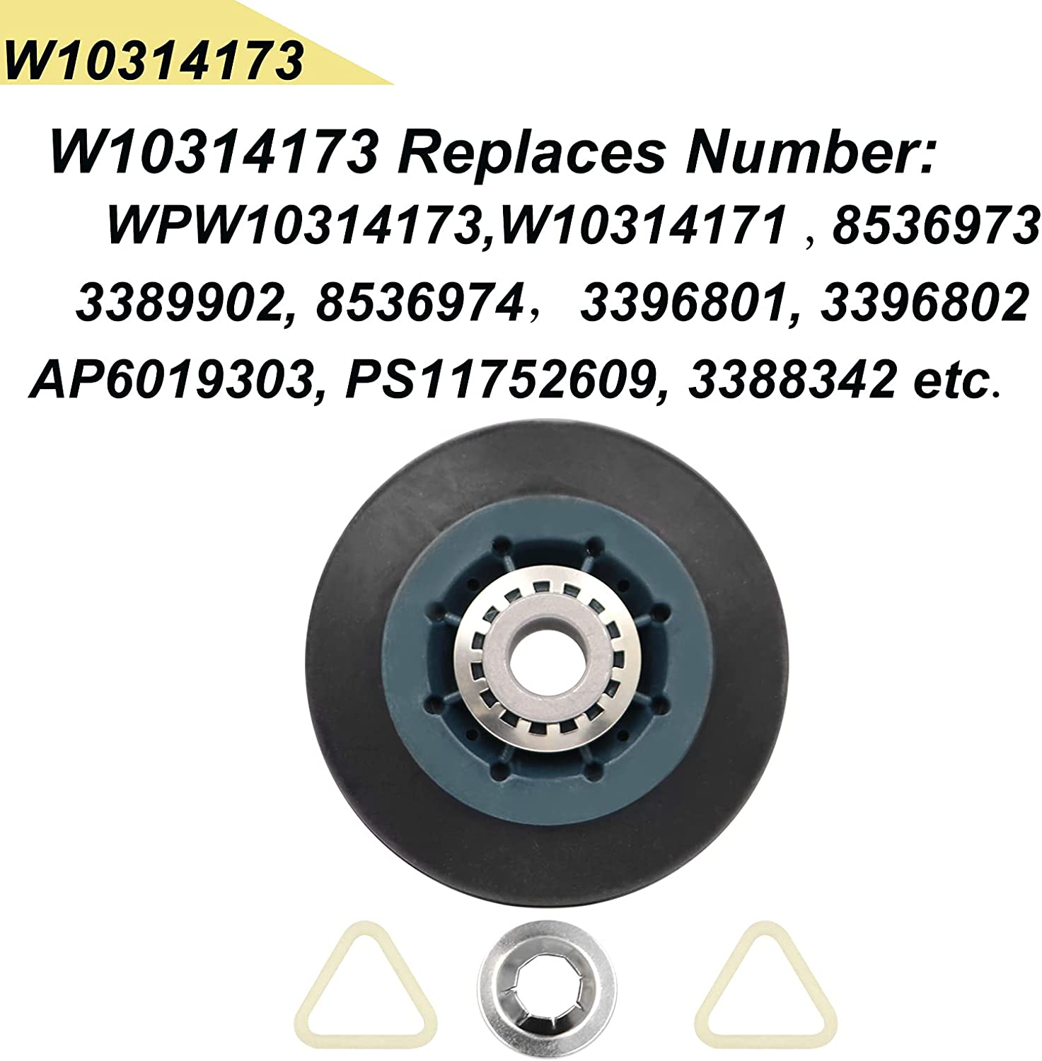 • Part Number W10314173 Replaces:W10314173 dryer drum Support rollers can replace W10314171 WPW10314173,8536973, PS11752609, 3389902, 3396801, 3396802, 3401846, 8536974, AP6019303, 3388342 and etc.