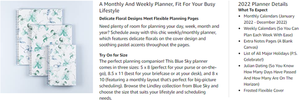 Plan your year in style with the beautiful florals and soothing colors of the 2022 calendar year Lindley collection. This stylish weekly and monthly planner will keep you organized everywhere you go. Simple page designs add a touch of sophistication and offer plenty of room for all of your important information. Designed with practicality and ease of use in mind, this floral agenda's monthly calendar tabs allow for easy access to each month’s plans while weekly views offer ample writing space for detailing each day. High quality white paper provides clean writing space for jotting down your appointments, to-dos and reminders. Use this dated planner to keep track of your appointments, and to write down notes and ideas in one place. Durable coated tabbed dividers are long lasting and make accessing information a breeze. Premium quality covers and twin-wire binding provide reliable durability for daily use. Stay on track throughout the year with this 5 x 8 planner dated January 2022 - December 2022. Mix and match with other Lindley Collection planning products from Blue Sky to organize your daily life. Blue Sky creates modern and sophisticated organizational planners and calendars to fit the scheduling needs of busy people - whether it’s for business professionals, college students, teachers, or anyone with appointments to make note of. Keep your life organized with our full line of products including desk pad calendars, wirebound tabbed weekly and monthly planners with contacts and notes pages to accommodate your scheduling needs, and laminated two-sided wall calendars, all in a variety of colors and patterns to suit your lifestyle and personality.