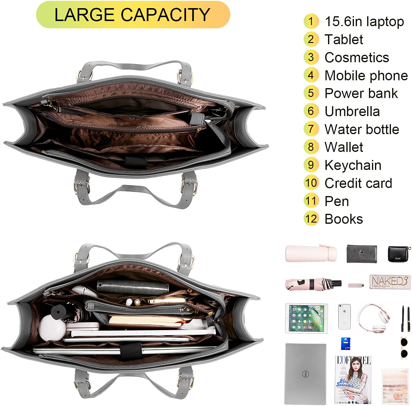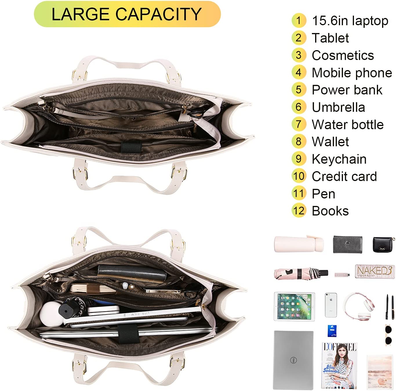 • 【Multi-pocket Design】Multiple pockets keep your belongings organized. The handbag structure consists of a 15.6-inch laptop pocket, an iPad pocket, a middle zipper pocket, an internal side zipper pocket, two large opening compartments, two small opening pockets, two pen pockets and an outer zipper pocket. And an external USB charging mouth.