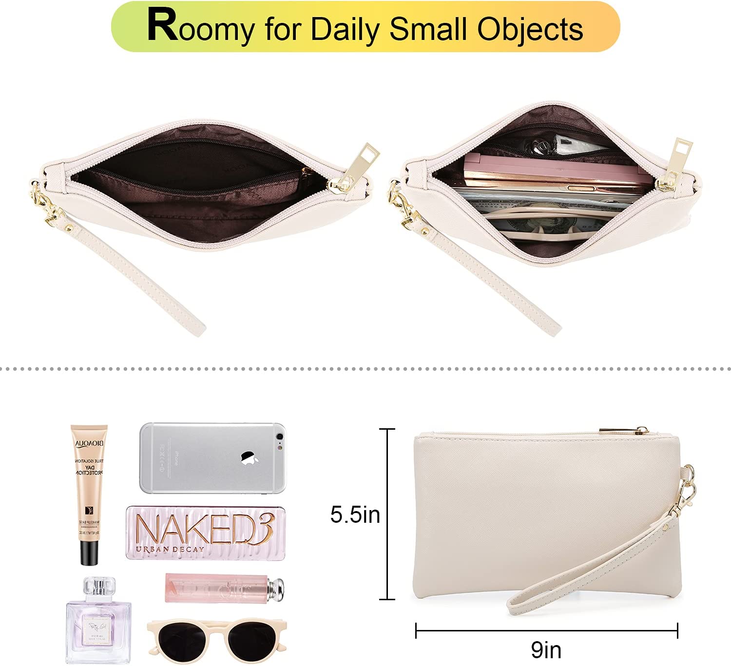 • 【Additional Clutch Bag】One more gift is a 9" L x 5.5" H detachable clutch purse. The clutch purse is made of soft PU leather, has smooth zippper on top closure, polyester lining inside. It can be used to organize and store small items such as change, jewelry, earphones, passports, keys and phones.