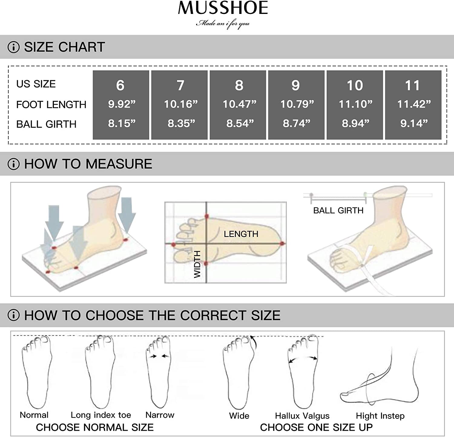 • 【SIZE SUGGESTION】: Please check our SIZE CHART for your best fitting,if any requests or questions,we'd love to help you at once. Appreciate for your support to our MUSSHOE!