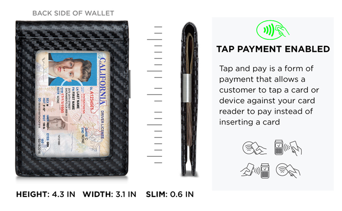 SLIM YOUR POCKET– HOW IT WORKS. This slim wallets for men reduces bulk with an efficient minimalistic design that makes everything easier. Best fits 7-10 credit cards, an ID plus US bills. Total of 11 available card slots (including 2 secret pockets). Perfect for carrying all debit, credit and all other cards. Store cash using the innovative stainless- steel money clip. Wallet Size: 4.3” in x 3.1” in x 0.6” in