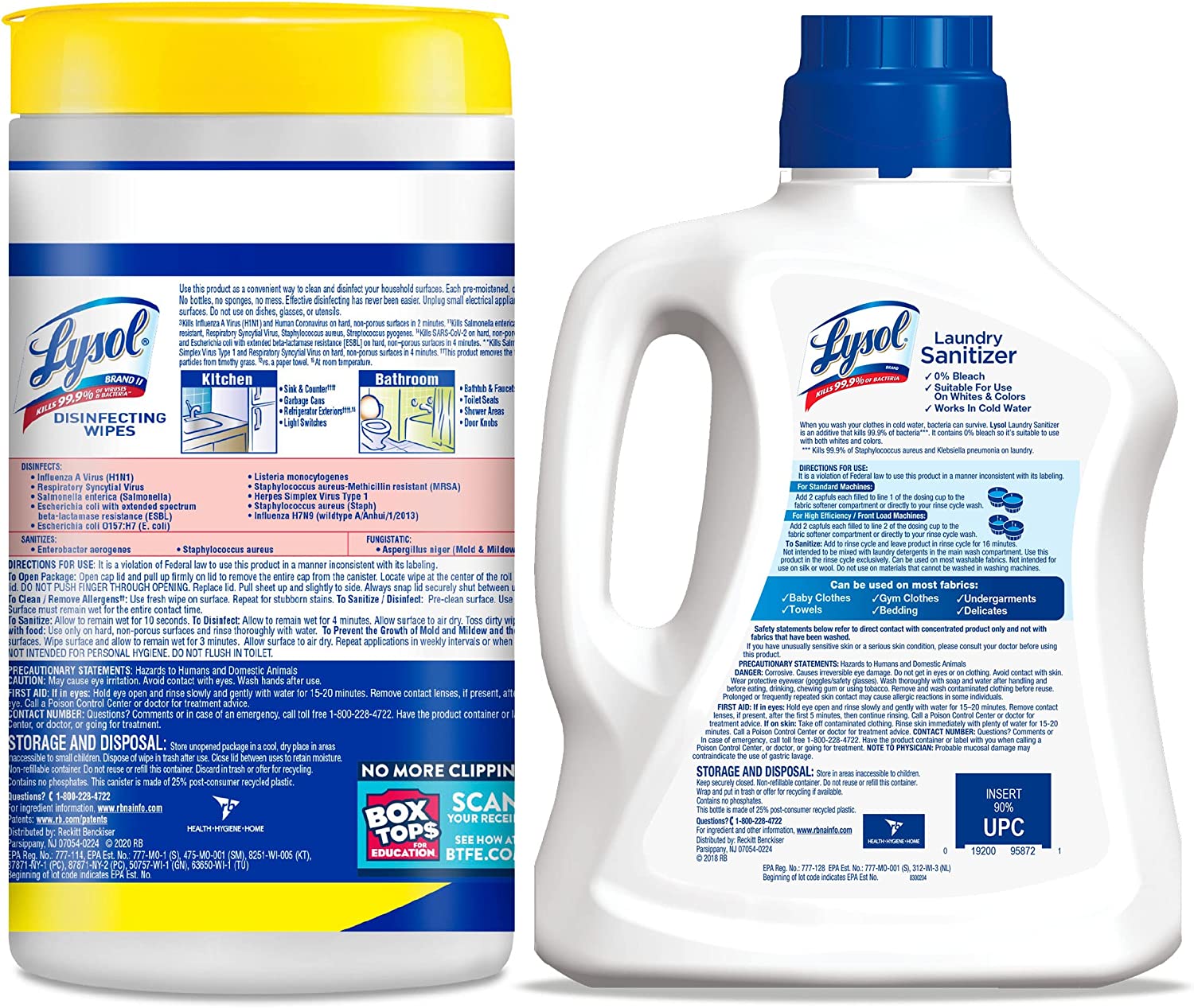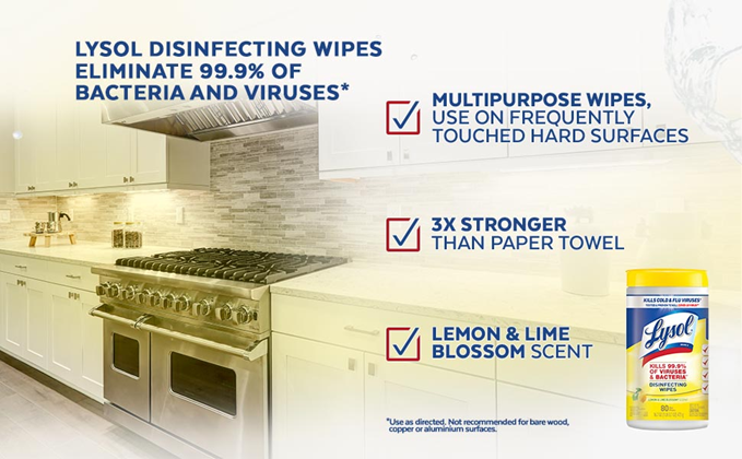 - Lysol Disinfecting Wipes: Kills 99.9% of viruses and bacteria, including 8 cold and flu viruses (when used as directed)
